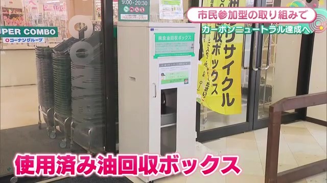 多久市のスーパーマーケット「HIヒロセ」や「中央公民館」に設置された回収ボックス。そこには、「使い終えた食用油をペットボトルに入れて持ってきてください」と呼びかける垂れ幕が掲げられています。多久市役所環境課の伊藤賢一さんは、「これはご家庭で使用された油を回収するためのボックスです」と説明します。