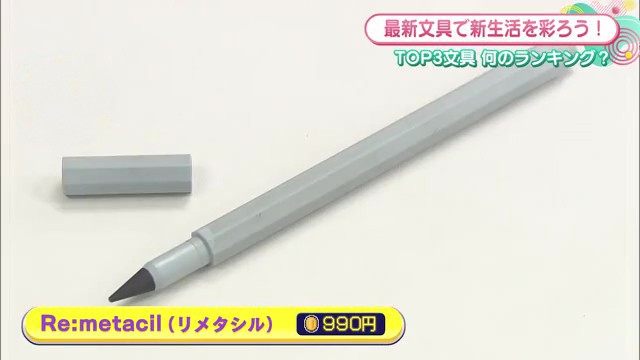 2位は、削る必要がなく約16km書くことができるペン「Re:metacil(リメタシル)」です。このペンの特徴は、芯と金属を含んだ特殊な芯を使用していることです。紙との摩擦によって書くことができ、消しゴムで鉛筆のように消すこともできます。