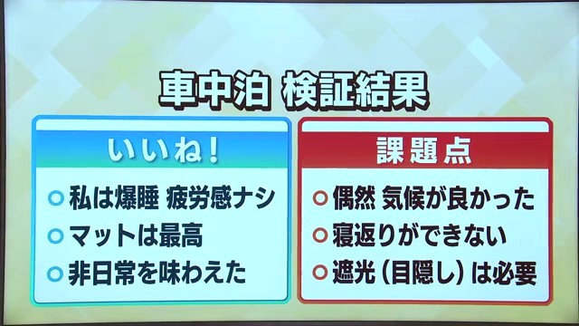 翌朝の検証結果は予想以上に良好でした。リポーターは「爆睡してました。1回も起きなかった」と満足そうにコメント。