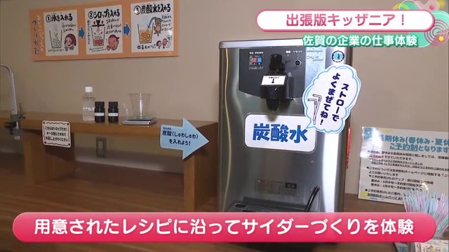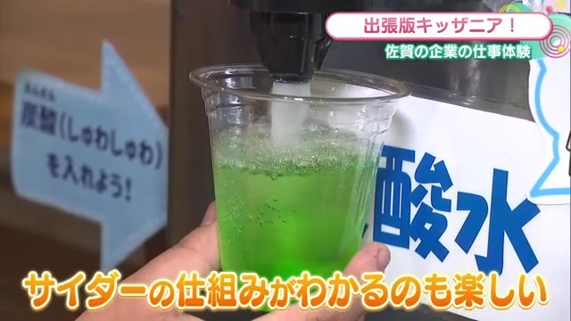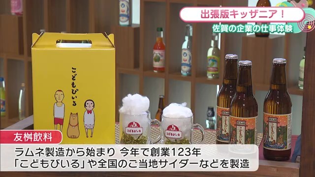 今回の仕事体験の目玉の一つが、佐賀県内で創業123年を誇る友桝飲料での製造体験です。ラムネ製造からスタートし、現在では「こどもびいる」や全国各地のご当地サイダーを手がける老舗企業で、子どもたちはサイダー作りの現場を体験できます。