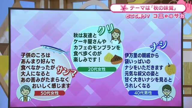 栗は栗ご飯、お菓子、モンブランなど、その汎用性の高さが人気の理由として挙げられました。サツマイモも「スイーツでもいけるし、そのままでもいい」と支持を集めています。