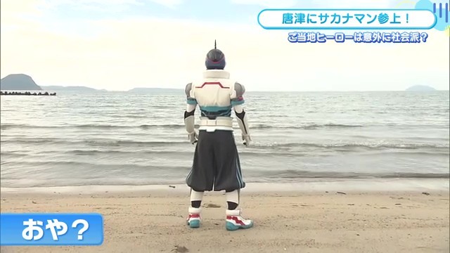 唐津市の虹の松原で活動するのは、白と青のスーツに身を包んだサカナマン。手にしているのは確かな活動の証である「ヒーロー賞」の表彰状でした。