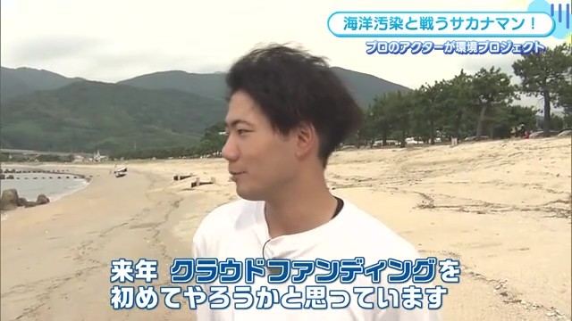 「海のゴミの問題を浄化する活動をしてるんですよ」とサカナマン。一見綺麗に見える海岸も、よく見るとペットボトルのキャップなど様々なゴミが散乱していることが確認できます。「海に来てゴミを見ると悲しい気持ちになりますね」という声に、「逆にそういうところに気づくことが大事」とサカナマンは応えました。
