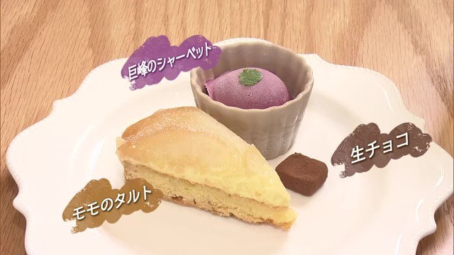 取材当日は、モモのタルト、巨峰のシャーベット、生チョコの3種類のデザートが用意されており、リポーターはモモのタルトを「桃がみずみずしい、生地自体がすっごい甘くて、それでいって桃の邪魔をしてない。お互いにお互いの甘さがいい感じに調和されてますね」と絶賛。