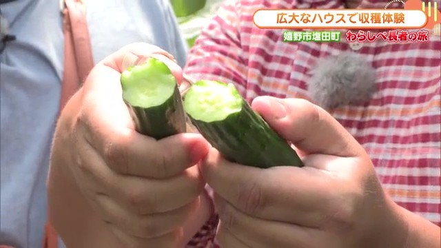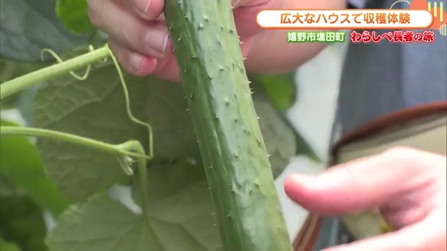 まず案内してもらったのはキュウリのハウス。中に入ると、リポーターが思わず驚くほどの熱気!ハウス内は想像以上に暑く、湿度も高めです。
