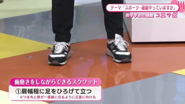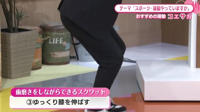 番組では、百武整形外科の整形外科医監修のもと、日常生活に取り入れやすい簡単な運動として「歯磨きをしながらできるスクワット」を紹介しました。