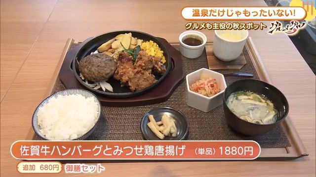 人気メニューの一つが、佐賀牛を100%使用したハンバーグと、みつせ鶏唐揚げのセットです。