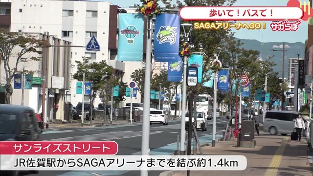 「ということで可愛いバスとはここでお別れ。今回は歩いてSAGAアリーナを目指します」として、実際に徒歩でのルートを体験。佐賀駅からSAGAアリーナまでは1.4キロメートルの距離があり、歩いて約20分程度で到着できます。