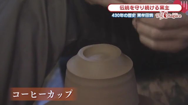 コーヒーカップの取っ手を付ける作業も、黒牟田焼の繊細さを物語る工程の一つです。「これをちょっと逆楕円にするんですよ。高温で焼くので、これが焼いた時に引っ張って来る。この状態にしておけば、ちょうど焼いた時にこれがまん丸になります」。焼成による変化を見越した緻密な計算が、美しい仕上がりを生み出しています。