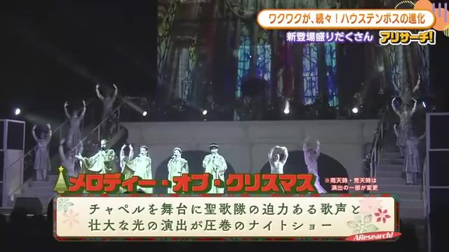 期間中毎晩開催される「メロディー・オブ・クリスマス」は、歌声と光の演出が圧巻のナイトショーです。チャペルを舞台に、聖歌隊の迫力のある生歌とプロジェクションマッピングが織りなす壮大な光の演出が重なり、その空間は一瞬で特別な世界へと変わります。