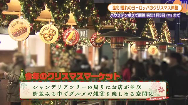 今年のクリスマスマーケットは、シャンデリアツリーを眺めながら楽しんでもらいたいという思いから、クリスマススクエアに会場を移設。グルメ12店舗、フード6店舗と店舗数もバージョンアップしています。より本場ヨーロッパの雰囲気を堪能できるようになったクリスマスマーケットでは、ここだけのグルメやドリンクが勢ぞろいしています。