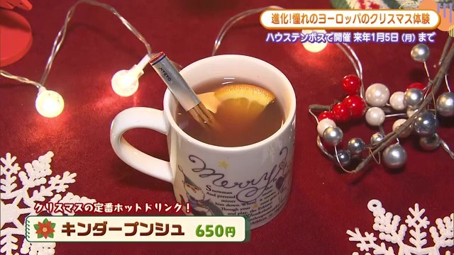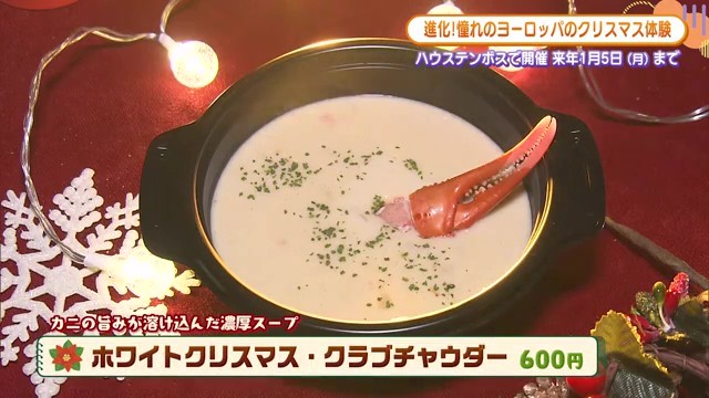 カニの旨味がしっかり溶け込んだ濃厚クラブチャウダーや、フルーツの甘酸っぱさとスパイスが香るホットドリンク「キンダープンシュ」など、限定グルメを思う存分味わうことができます。