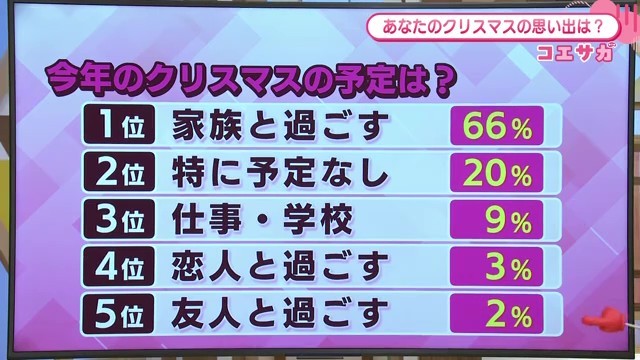 番組で実施したアンケート「今年のクリスマス、予定は?」では、「家族と過ごす」が66%と圧倒的多数を占めました。続いて「特に予定なし」が20%、「仕事・学校」が9%、「恋人と過ごす」が3%、「友人と過ごす」が2%という結果になりました。