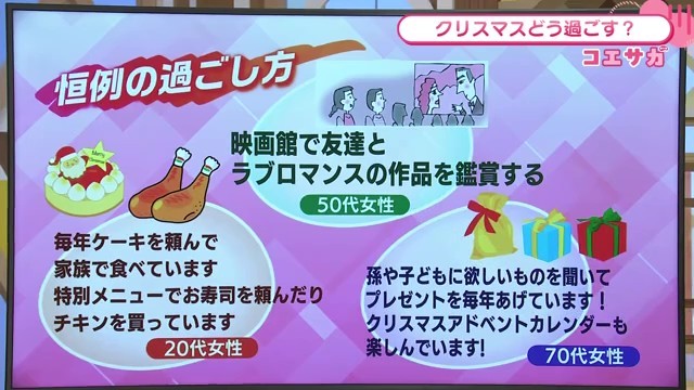リポーターによると、「昔は映画館デートがクリスマスの定番」だったものの、今回の回答では映画を見るという方がこの1人だけで、「時代的なものも感じる」とのコメントがありました。 - 70代女性からは「孫や子供たちに欲しいものを聞いて、プレゼントを毎年あげています!クリスマスアドベントカレンダーも楽しんでいます」という、世代を超えた愛情あふれるメッセージも届きました。