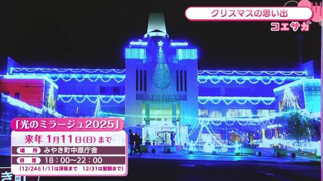 番組では実際のイルミネーション写真も紹介されました。みやき町中原庁舎のイルミネーションは「光のミラージュ」と呼ばれ、今年で21回目を迎える人気スポットです。点灯式には3000人もの人が訪れるそうです。