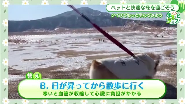 「お散歩をする時は急激な温度変化を避けましょう。寒いと血管が収縮して血圧の変動が激しくなり、心臓に負担がかかってしまいます」