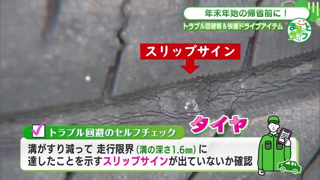 「タイヤの側面に三角マークがついてるんですけども、ここの延長線上にスリップサインっていう1つこっと出てるところがあるんです」と野田店長。スリップサインとは、タイヤの溝が残り1.6ミリになったことを表すサインで、この1.6ミリは「走行限界」と言って車検にも通りません。