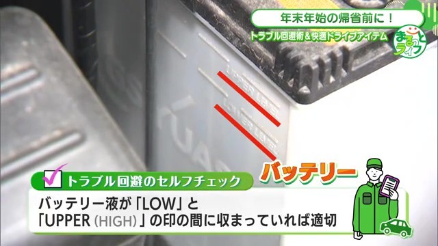 バッテリーには「LOW」と「HIGH」の目印があり、この範囲内にバッテリー液が入っているかを確認します。「いつもよりエンジンがちょっとかかりづらい、いつもより音が小さくなってるとかということになれば、バッテリーが弱ってるサインにもなる」と店長さんが言っております。