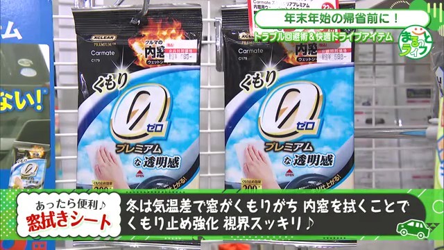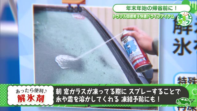「今の時期ですよ、車に乗り込む朝の際とか、気温が低下することによってフロントガラスが凍結してですね、すぐに車が運転できないということが多々発生しますので、その時に使っていただける便利グッズ」として解氷材を紹介。