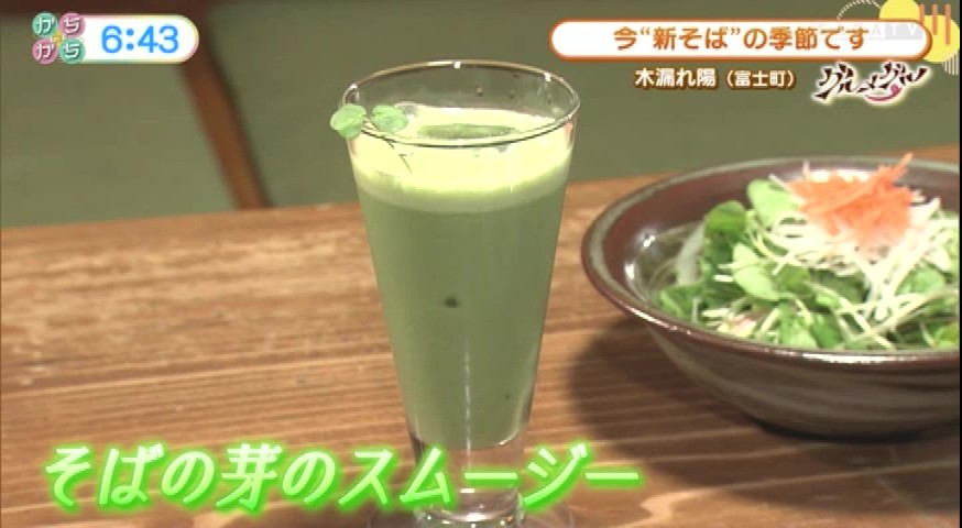 特に注目は「そばの芽のスムージー」。リポーターは「甘いです。そばの芽のちょっとした青っぽさがすごくいいアクセントになって」と表現し、友田さんは「甘みは蜂蜜を使っております。豆乳も使っておりますね」と説明しています。