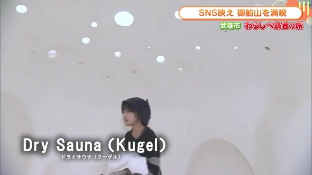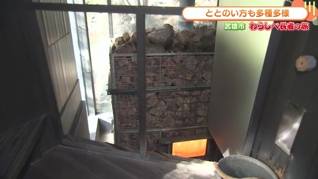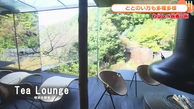 薪が入って暖かい空間で御船山の自然を眺めながらの外気浴にはリポーターも大絶賛。寝そべれるタイプの椅子に身を委ねながら至福のひとときを過ごせます。