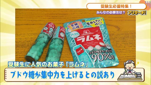 受験のお助けフードとして挙がったのが「ラムネ」。「ぶどう糖が入っているため、集中できる」とのことで、ラムネは必須アイテムとなっているようです。
