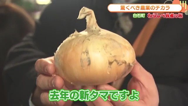 実際に保存されている去年の新玉ねぎを見せてもらうと、その鮮度に一同驚きました。リポーターは「去年の新玉」と言われても「信じられん」と声を上げるほどの状態でした。
