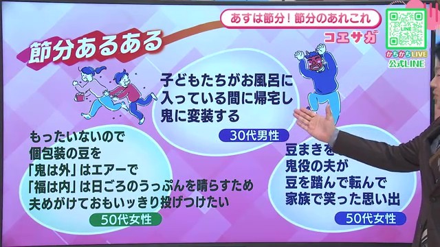 一方で、奥様方からは「福は内は日頃の気持ちを晴らすために夫めがけて思いっきり投げつけたい」と、日頃の気持ちを晴らすチャンスとして捉える声も。