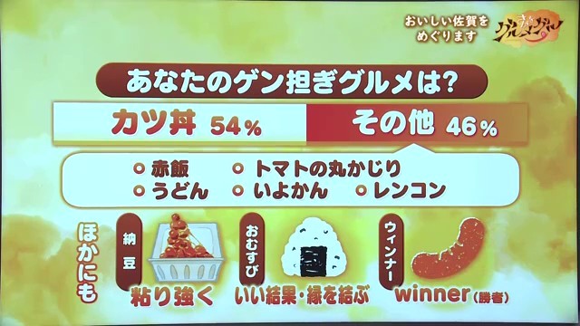 かちかちLIVEの公式LINEアンケートでは、カツ丼やとんかつのほか、粘り強い納豆、縁を結ぶおむすび、ダジャレのウィンナー(ウィン=勝つ)など、さまざまなゲン担ぎグルメが挙げられました。