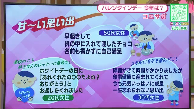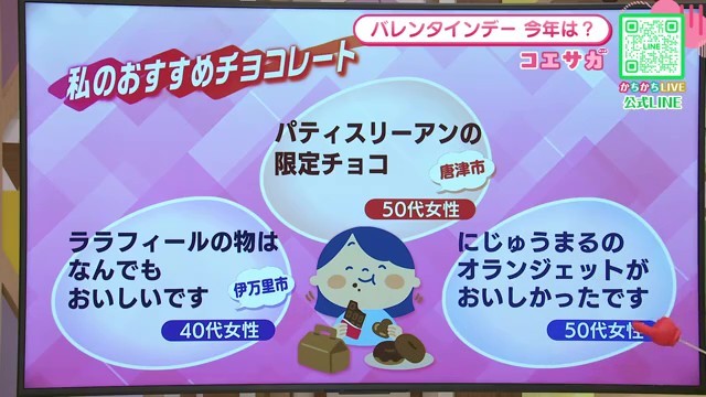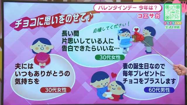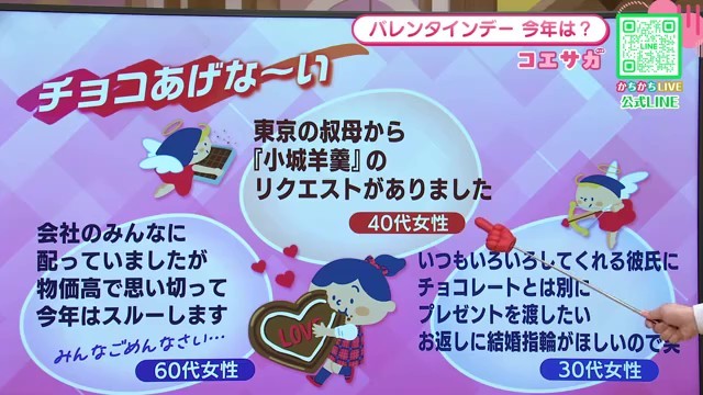 60代の女性からは「会社のみんなに配ってましたが、物価高で厳しいので今年は渡せません。ごめんなさい」という声が届きました。また、40代の女性からは「チョコレートじゃなくて、小城羊羹のリクエストがあった」という、佐賀らしいエピソードも紹介されました。