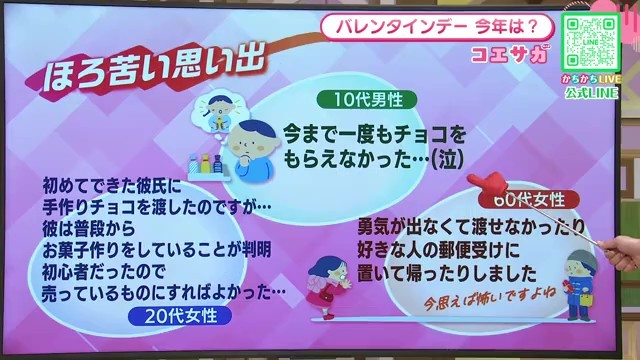 10代男性からは「今まで一度もチョコをもらえなかった」という切ない声や、60代女性からは「勇気が出なくて渡せなかったり、好きな人の郵便受けに置いて帰ったりしました。今思えば怖いですよね」という、今だから言える思い出も紹介されました。