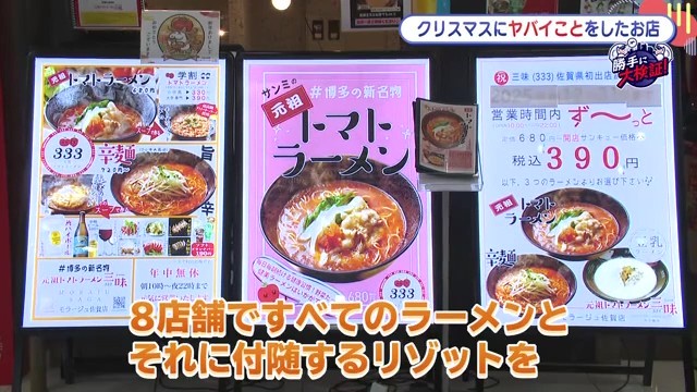 元祖トマトラーメン三味は、クリスマスに福岡7店舗とモラージュ佐賀店の合計8店舗で、トマトラーメン、辛麺、元祖豆乳ラーメンなど全メニューを無料提供したそうです。その数なんと1万8800杯、総額1278万4000円相当の大盤振る舞い。