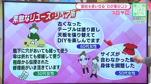 また、「亡くなった母の服を補正して着ている」「学生時代の体操服は子どもがそれぞれ活用」など、家族の思い出とともに物を大切に使い続ける温かい節約術もありました。