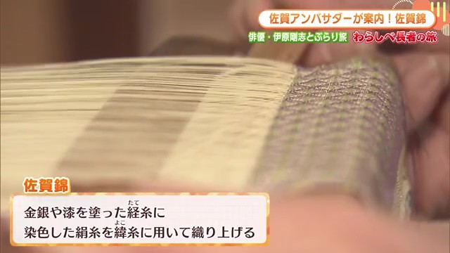 佐賀錦は、佐賀藩の武士の内職として発展した伝統工芸品です。スタッフの方によると「経糸には漆を塗った和紙を使い、緯糸には針に通せるほど細い糸を使って織り込んでいきます」とのこと。