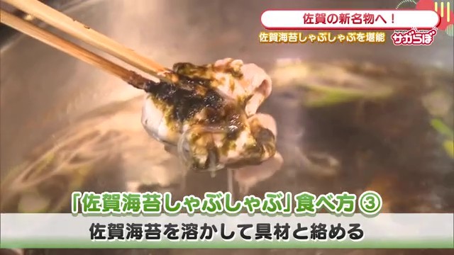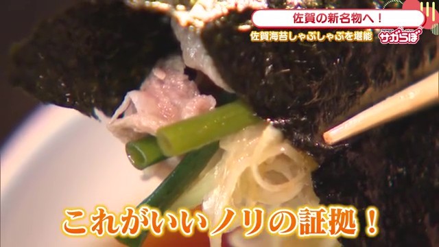 まずは定番の食べ方。しゃぶしゃぶしたお肉と野菜を佐賀のりでくるりと巻いていただきます。リポーターは「パリパリの食感とのりの香りが前面に来ます。佐賀牛のしゃぶしゃぶがとろけるのと同じ感覚で、口の中でのりがほどけていくのが分かります。いいのりの証拠ですね」と感動の様子でした。